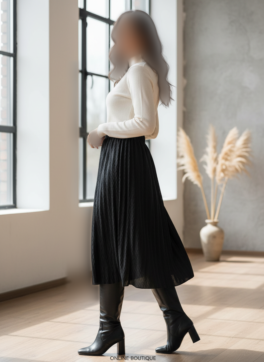 دامن ساتن کشی لطیف پرچین قد میدی مشکی فرندز